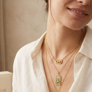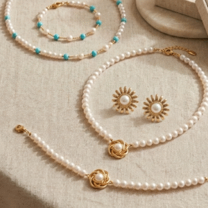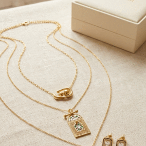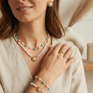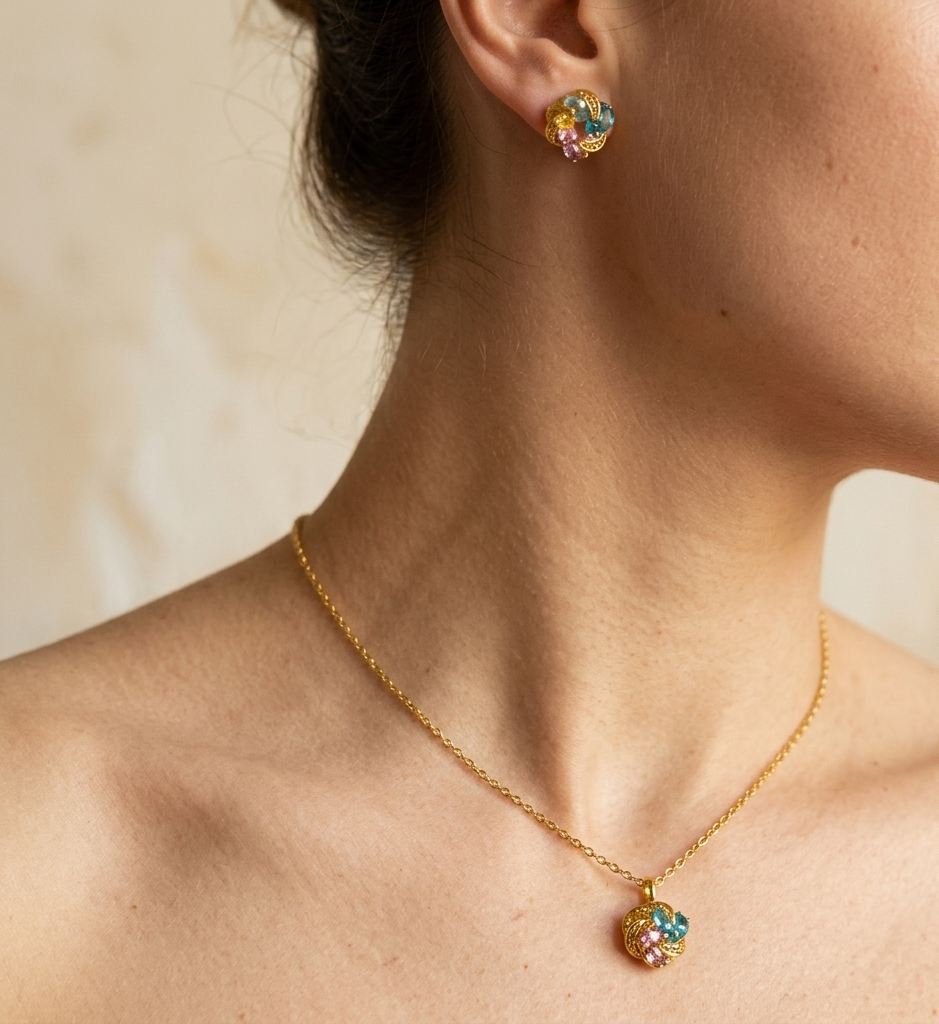 Collier et boucles délicats aux pierres colorées, sublimés par une lumière naturelle douce pour un rendu élégant et intemporel.