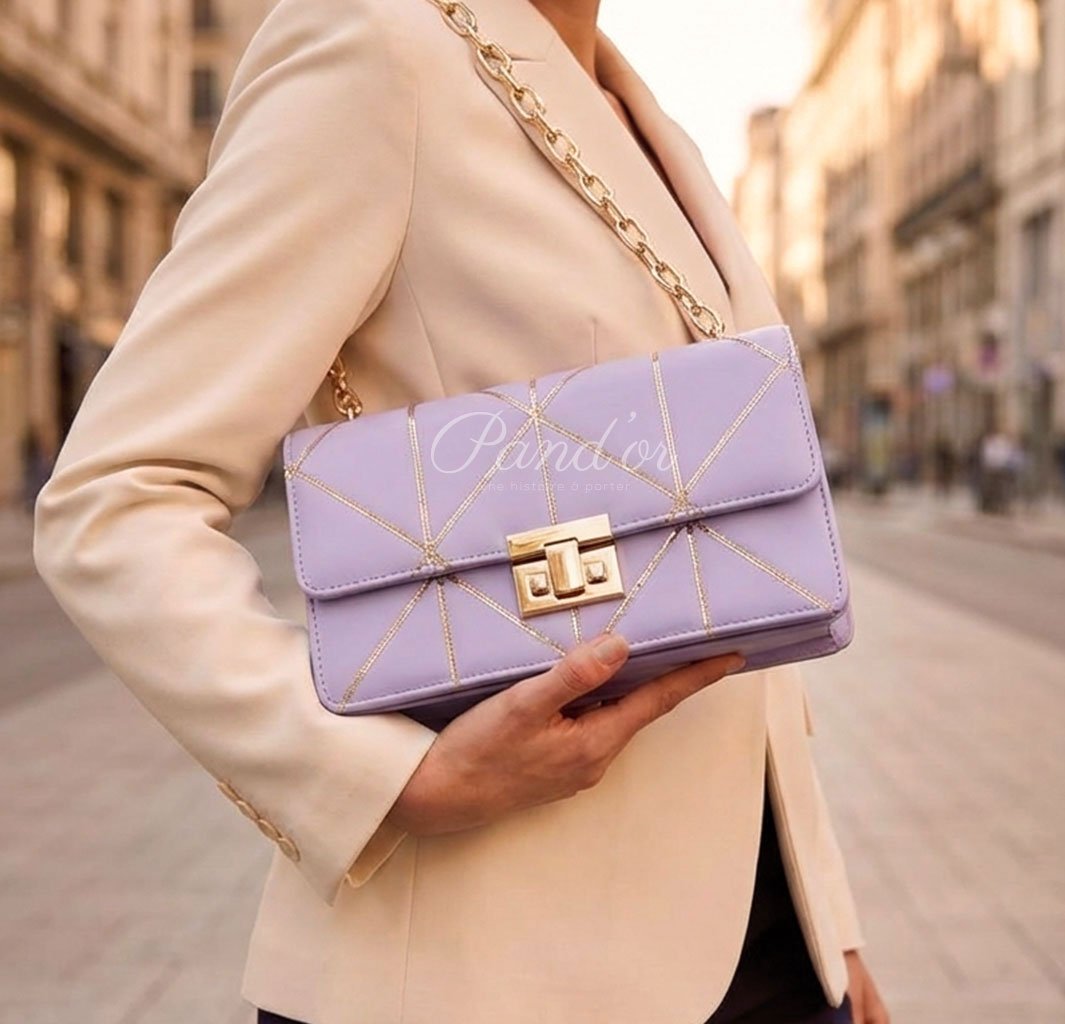 Sac structuré aux lignes géométriques raffinées, sublimé par un fermoir métallique moderne et une chaîne sophistiquée. Une pièce féminine et tendance, parfaite pour rehausser un look habillé ou casual avec une touche parisienne.