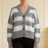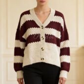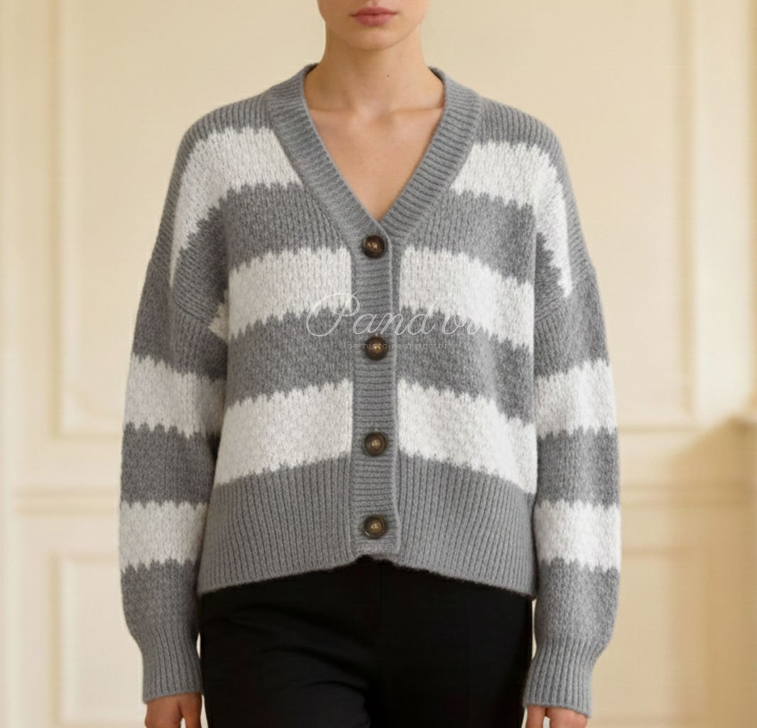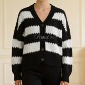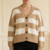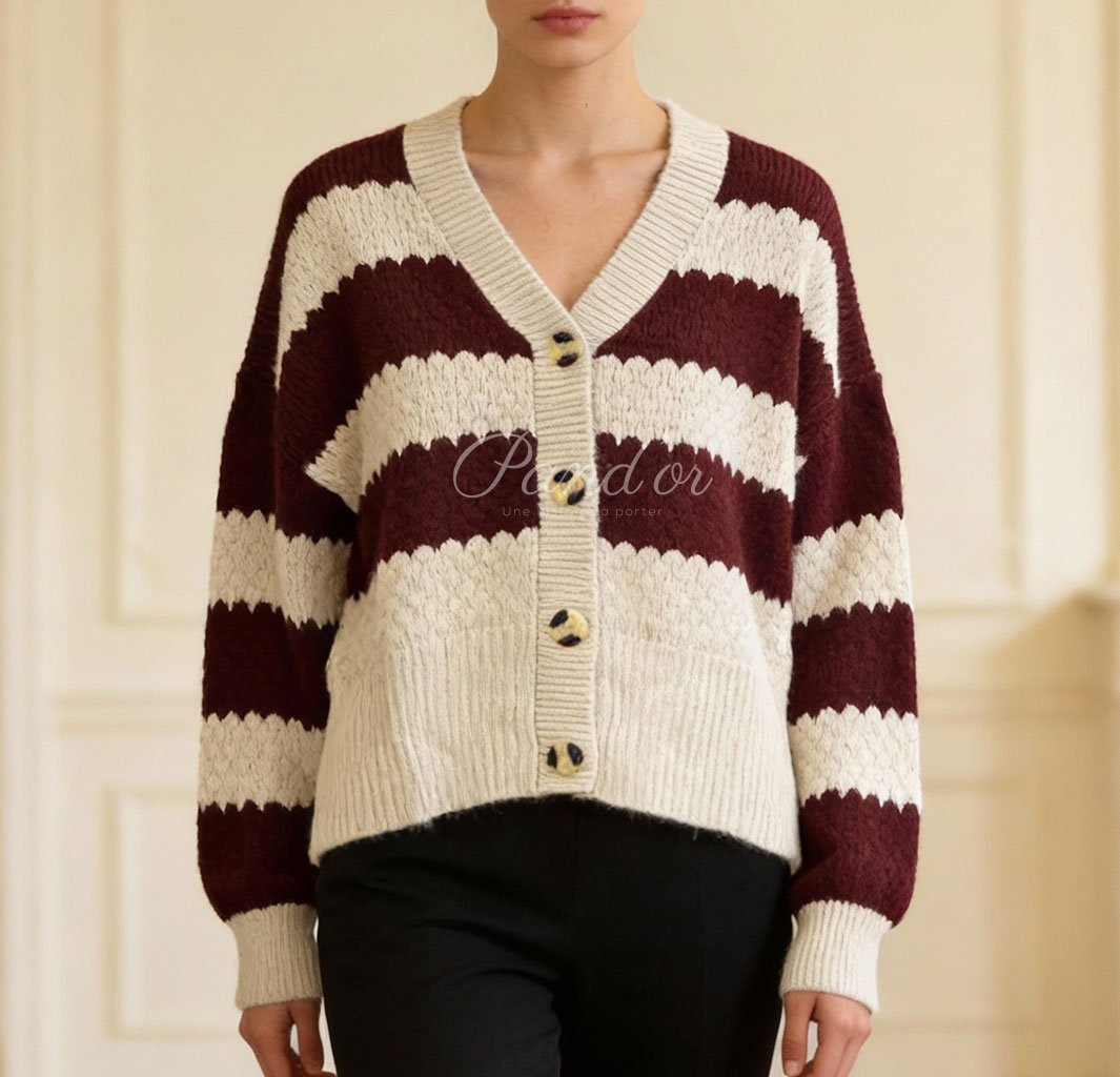 Gilet en maille à motifs rayés, à la coupe confortable et moderne. Son design intemporel et ses finitions soignées apportent une touche élégante et chaleureuse, idéale pour un look chic et décontracté au quotidien.