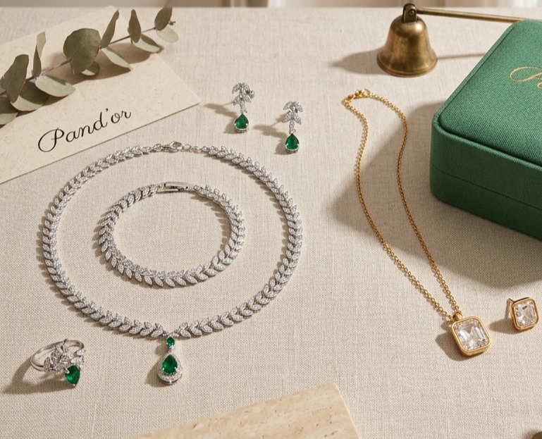 Un pack PAND’OR réunissant deux ensembles raffinés : parure feuille avec pierre verte et duo cristal carré lumineux, pour une élégance complète et moderne.