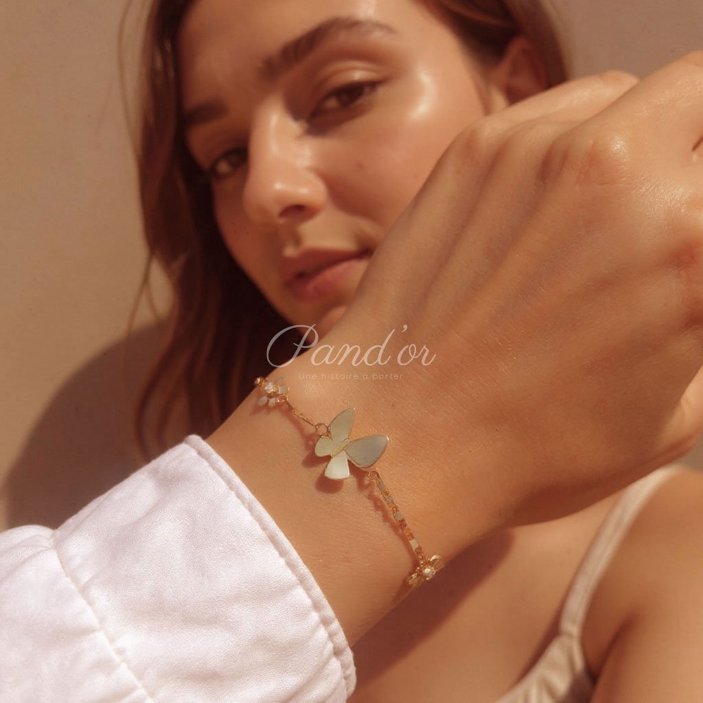 Bracelet en acier inoxydable doré orné d’un papillon nacré et de petites perles délicates. Style doux, féminin et lumineux. Résistant à l’eau et au ternissement. Un bijou élégant qui apporte une touche légère et poétique au poignet.