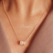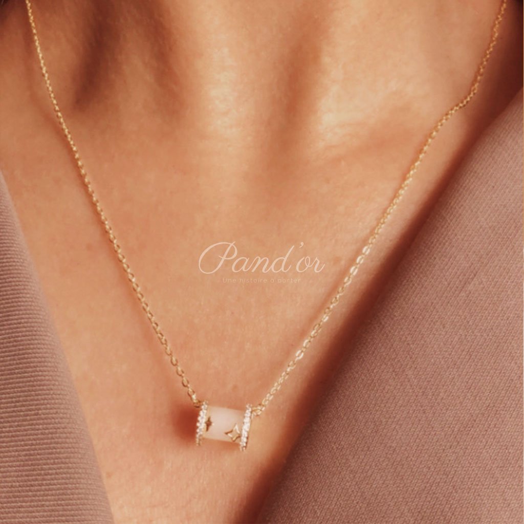 Collier en acier inoxydable doré avec pendentif cylindrique nacré, délicatement encadré de zircons. Design doux, moderne et lumineux. Résistant à l’eau et au ternissement. Un bijou élégant qui apporte une touche raffinée et subtile à chaque tenue.