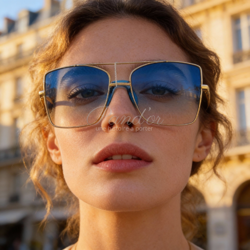 Un cadrage serré et une lumière dorée mettent en avant les traits du visage et la présence affirmée des lunettes.