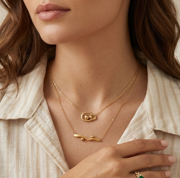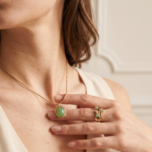 Un trio raffiné réunissant deux colliers minimalistes et un ensemble complet serti de pierre verte, pensé pour sublimer chaque tenue avec une élégance lumineuse et intemporelle.